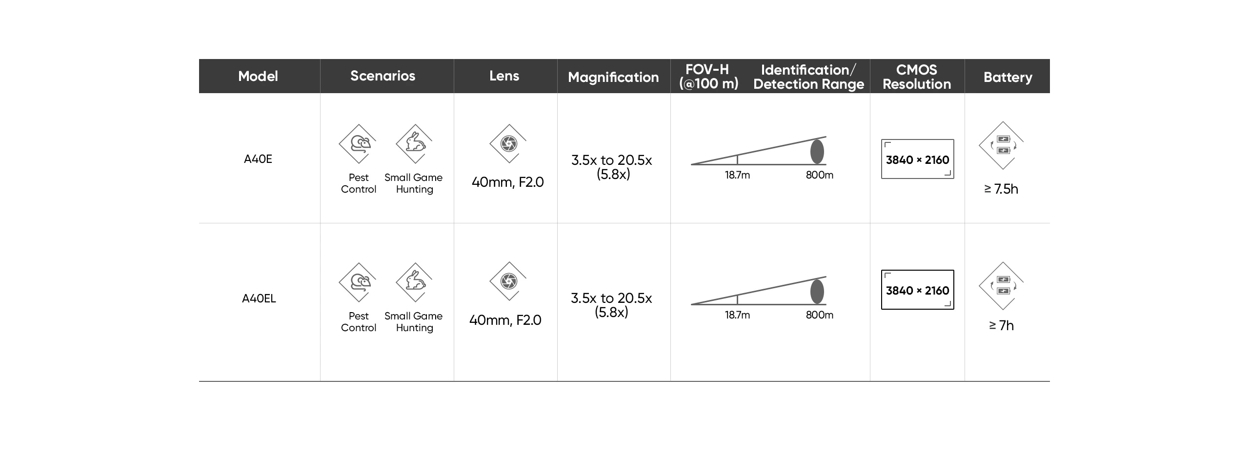 The A40EL features a 40mm/F2.0 lens, a 4K UHD sensor, and a built-in 1000m laser rangefinder, offering hunters exceptional accuracy and a field of view suitable for pest control and small game hunting. An optional IR flashlight enhances nighttime performance.