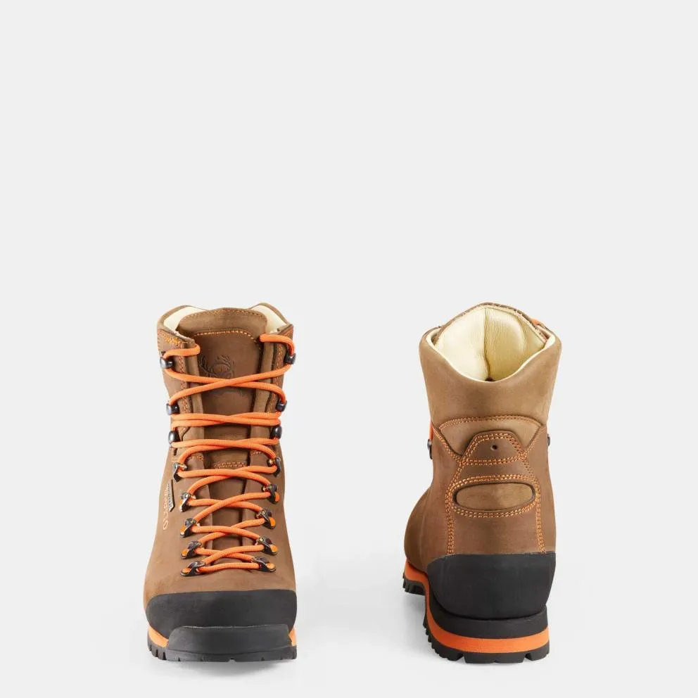 Scarponi da caccia e trekking Alta Visibilità, in pelle nabuk smerigliata color marrone idrorepellente a taglio unico.