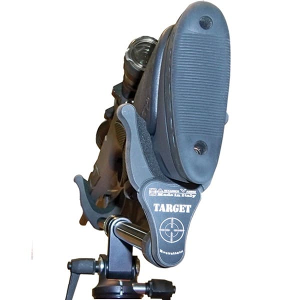 Il Target è roteante a 360° e basculante tramite le due manopole registrabili poste nel suo cuore; sono proprio tali regolazioni che permettono di bloccare l’arma in posizione o lasciarne frizionare il movimento in modo da poter seguire il selvatico durante lo spostamento sempre mantenendo la massima fluidità sui due assi.