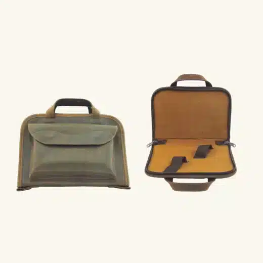 FO 11 – Fodero per pistola in pelle idrorepellente ingrassata con effetto nabuk, interno imbottito con ferma pistola elastico, bordo e maniglia in pelle e con robuste cuciture che ne garantiscono la durata. Apertura totale con cerniera YKK. Misure: cm 21 x 30 x 4. Con tasca esterna porta caricatori.