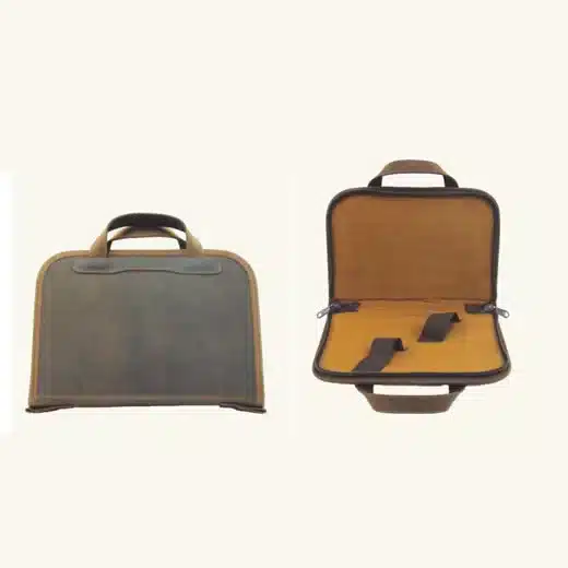 FO 11 – Fodero per pistola in pelle idrorepellente ingrassata con effetto nabuk, interno imbottito con ferma pistola elastico, bordo e maniglia in pelle e con robuste cuciture che ne garantiscono la durata. Apertura totale con cerniera YKK. Misure: cm 21 x 30 x 4