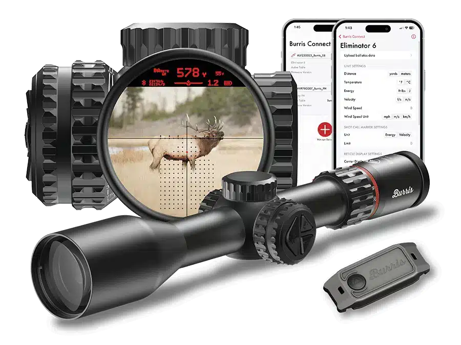 - Compensazione balistica: le soluzioni balistiche dell’Eliminator 6 sono basate sull’app mobile BurrisConnect e caricate sul cannocchiale. La connettività Bluetooth tra il cannocchiale e il dispositivo mobile dell’utente consente al cacciatore di creare una scheda DOPE interna nell’Eliminator 6 che combina dati di distanza, ambientali e balistici per ottenere il tiro perfetto. Gli utenti possono creare profili utilizzando i dati di munizioni di fabbrica che troveranno sul database dell’app o inserendo i dati balistici per le munizioni ricaricate, questo partendo dai fucili ad avancarica, pistole, fino alle carabine da caccia e da tiro.